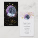 Sentado na lua de aquarela é um BUQUÊ de flores azuis, penas e cristais. Há um esboço falso de GOLD FOIL de uma mão debaixo da lua lavanda roxa.Este design Celestial Místico Místico e Mesmerizante Cosmos Cosmos Cosmic Dourados Stars Watercolor é popular nos cartões de visitas.