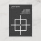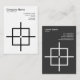 Um modelo de cartão de negócios com um círculo vago ou símbolo 'O' na frente. Nome da empresa, tipo de negócio e endereço na frente com nome, cargo, telefone, web e endereços de e-mail no verso, com um layout semelhante em um fundo de cinza com uma repetição do símbolo frontal em branco. Este cartão também pode ser mais personalizado.