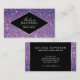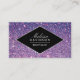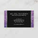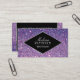 Uma imagem de fundo brilhante roxa profunda e rica fornece um pano de fundo glamouroso para este modelo de cartão de negócios com tema de beleza. Seu nome ou nome comercial é elegantemente estirado em uma placa de nome cortada em prata para um logotipo clássico. Motif na moda design para salões de beleza, designers de unhas, maquiadores, cosmetólogos, estilistas de moda, boutiques e muito mais. © 1201AM CREATIVE