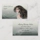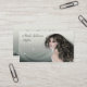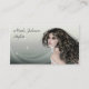 Cartão de visita com a mulher bonita com cabelo longo, encaracolado vestindo a composição bonita. Fundo, parte dianteira e parte traseira verdes abstratos do inclinação. Aperfeiçoe para cabeleireiros, artistas de composição, cosmeticians ou forma.