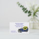 Esta cartão de visita é decorada com um caminhão de cimento azul e amarelo no canto inferior esquerdo.