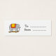 Uma etiqueta de presente personalizada com arte safena de um elefante de brinquedo em rodas vestindo um cobertor amarelo e vermelho, restaurada a partir de um livro infantil. Clique em Personalizar para alterar fontes, dimensionamento, cores de fundo e muito mais.