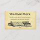 Um cartão de visita de estilo em prato de livros com letras vintage e espaço para suas informações na frente e atrás, com a arte de livros antigos e uma colina escrevendo na frente e velhas pilhas de livros nas costas, em um fundo falso de pergaminho.