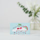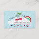 Cerejas bonitos que sentam-se em uma nuvem que chove corações com arco-íris em um fundo azul removível neste cartão de visita home do cozimento ou da padaria para biscoitos, bolo, cupcake, ou negócio da torta.