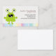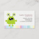 Esta é uma cartão de visita de babá com uma engraçada alienígena verde-monstro no lado esquerdo da carta. Há uma borda estriada pastel na parte inferior do cartão, com seu nome, título e detalhes básicos de contato no lado direito do cartão.