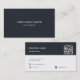 Simples cartão de visita de código QR preto corporativo personalizado em um estilo moderno minimalista. O modelo pode ser atualizado facilmente com seu código QR e informações de contato. O lado frontal é azul escuro, o lado traseiro é branco e azul