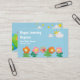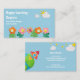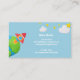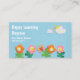 Um Cartão de visita de creche com flores brilhantes, estrelas amarelas e uma borboleta em uma frente azul. O reverso é projetado com um foguete de brinquedo infantil e estrelas amarelas, sobre fundo azul. Para personalizar, basta inserir seus detalhes em nosso modelo fácil, substituindo o texto de exemplo.