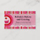 Cartão de visita de cozimento ou catering em faixas cor-de-rosa brilhante, verdes e verdes e motif cupcake. Texto editável todo formatado e pronto para personalizar no editor de texto fácil do Zazzle. Criado com gráficos (c) Clipart colorida.