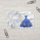 Cartão de visita de marcenaria elegante, com gráficos de um vestido azul brilhante, contra um fundo prateado e branco marmoreado, com sotaques de diamante falsos. Personalize o texto para atender às necessidades de sua empresa. Um cartão de destaque adorável para o seu negócio de alfaiate.