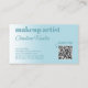 Cartão de visita de artista de maquiagem artística com estilo minimalista elegante e sofisticado. Cartão de visita contemporâneo em azul oceano claro com uma fonte moderna retrô e minimalista em aqua seafoam teal e branco sofisticado e clássico. Clique em 'Personalizar' para encontrar o modelo pronto para ser personalizado com o nome da sua empresa, profissão e informações de contato, texto e código QR de sua escolha. Este design particularmente bonito e único foi feito para aqueles que gostam de designs clássicos sofisticados e fortes.
