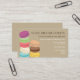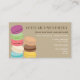 cartão de visita de uma padaria ou de um pasteleiro com uma ilustração de oito macarões franceses à esquerda. Personalize o texto com suas informações.