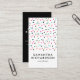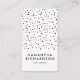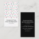 Um cartão de visita vertical divertido, colorido, mas profissional, com um padrão de triângulos esparsos multicoloridos, com espaço branco no terço inferior da placa dando nome e detalhes de serviço. O verso tem um sofisticado fundo preto, com detalhes de negócios e contatos em caracteres brancos modernos. Este design é excelente para planejadores de eventos e qualquer outro profissional.