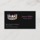 Este modelo de cartão de negócios personalizado é mostrado em preto com um exemplo de texto em Cinza e nome pessoal destacado em Berry (as cores do texto são amostras). Ele tem uma impressão de coroa prateada brilhante. Personalize alterando as cores do texto e do texto de acordo com o seu gosto.