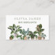 Um cartão de visita de horticultura, adequado a um viveiro de plantas ou a uma pequena empresa. Em fundo branco, o design botânico consiste em imagens de aquarela de nove plantas, incluindo ficus, peperomia, aloe vera, calathea, pothos e aves do paraíso. Personalize adicionando seus negócios e detalhes de contato à frente e atrás.