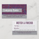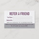 Cartão de visita de referência de Salon. cartão de visita de referência personalizada com uma promoção de referência para recompensar seus clientes por consultar seus amigos. O cartão tem um esquema e uma cor modernos de design. Excelente para marketing do seu salão ou estilista e para aumentar a sua lista de clientes.Introduza nas suas próprias informações de promoção, isenção de responsabilidade e empresa. GPerfect para um salão, barbeiro, estilista, salão de beleza, esteticista ou salão de mani e pedicure.