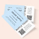 Uma simples modelo de passagem de rifa em uma tipografia moderna em estilo minimalista em preto e branco simples sobre um fundo azul pastel de bebê. O modelo pode ser facilmente personalizado com os detalhes de seu evento, incluindo data, preço de entrada, prêmios e detalhes de caridade. Você também pode carregar facilmente o código QR do seu evento ou site de caridade.