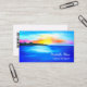 Cartão de visita de Design Interior na praia tropical, com um design de oceano por sol. As letras brancas e pretas podem ser personalizadas com seu próprio texto. Você também adiciona seu site no campo de código QR. Cheio de cores azuis e vermelhas, este cartão adiciona um toque de abstrato ao mesmo tempo que promove seu negócio de decoração em casa.