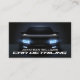 A lavagem moderna de carros automotivos e o cartão de visita de detalhamento automático apresentam um ícone de carro em um fundo escuro, um detalhamento de carro de script de tipografia e um nome/nome comercial.