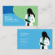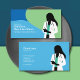 A business card design featuring a silhouette of a woman with long hair, wearing a white coat and a stethoscope around her neck, and she has a notepad in her hand. The background is blue and green.