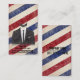 Cartão de visita do barbeiro com barba, smoking, gráfico magro do laço. O cartão tem uma textura do grunge a ele e às cores tradicionais do fundo do barbeiro. Aperfeiçoe para um barbeiro, um barbeiro, uma barbearia, ou um estilista.