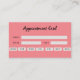 Um compromisso/cartão de visita cor-de-rosa com espaço no verso para compromissos. A frente tem seu logotipo e seu nome e endereço da empresa. Há 4 linhas para você personalizar. Excelente para cabelos e salões de unhas, mas também pode ser usado para médicos e dentistas.