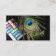 Design de cartão de visita do maquilhador com pena do pavão e a paleta colorida da sombra para os olhos no fundo preto. Este cartão de visita à moda é perfeito para meninas na moda, beauticians, cosmetologists, salões de beleza do cabelo e da composição e outras profissões similares. Se você precisa alguma ajuda com este design, sinta livre contactar-me.