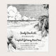 Cartões de visita dobráveis personalizados com letras em bloco e script retrô sobre uma gravação vintage tropical de palmeiras em uma praia arenosa e belas nuvens sobre ondas calmas do oceano.