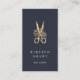 Cartões de visitas verticais elegantes para penteados apresentam um par de tesouras estilistas em folhas falsas de ouro enfeitadas com flores, em um rico fundo azul marinho com duas linhas de texto personalizado em branco. Personalize a parte traseira com os detalhes do contato do cheio, mostrados abaixo de uma ilustração de tesoura correspondente menor.