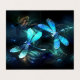 Duas libélulas transparentes, luminosas, turquesas, desenhadas artisticamente sobre fundo noturno, com algas e vagalumes luminescentes do lago. Dragonfly brilhante.