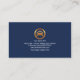 No verso, em um cobrir azul escuro, no topo está o logotipo dourado seguido do seu prestígio, dos seus dados de contato e de um slogan para anunciar os seus serviços.