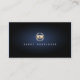 Este cartão de visita simples, mas muito elegante, apresenta um simples ícone dourado do clipe de vídeo do editor de vídeo incluso em um círculo dourado. O seu nome aparece em cores correspondentes e é fácil de ler a fonte abaixo deste ícone. O fundo é preto a jato com um brilho azul sutil no centro do cartão, atrás do nome e do ícone, dando ao cartão uma aparência impressionante. Perfeito para fotografia, filme, vídeo, habilidades artísticas, habilidades de filmagem, habilidades de vídeo, imagens, temas de edição de fotos.