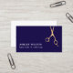 Elegant customizable business card template with FAUX gold scissors icon and midnight blue background. Minimalist design, perfect for beauty salon, hair stylist.