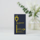 Um cobrir azul escuro, realçado por um plugue de alimentação amarelo muito grande que contém seu nome de prestígio, cargo e detalhes de contato perto da base.