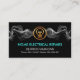 Uma onda de raios elétricos atravessa a face da placa, zapeando através de um logotipo de lâmpada dourada. Abaixo do logotipo ouro está o nome comercial seguido do seu nome prestigiado e dos seus contatos.