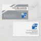 Uma design geométrica de cinzas criativas com seu nome prestigiado e cargo na coluna branca superior. Uma legenda de slogan para divulgar seus serviços está logo abaixo do cargo. Isso é seguido por um logotipo azul de tomada de alimentação que você pode usar. Os detalhes do contato estão localizados nos respectivos botões brancos, perto da base do cartão.