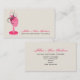 Uma loja de roupas / cartão de visita boutique apresentando uma ilustração de um suporte de chapéu cor-de-rosa vestindo um fascinador rosa, preto e cinza. Personalize o texto rosa e preto com suas informações.