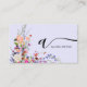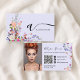 Apresentando um elegante e profissional cartão de visita preto e branco para cabelos e maquiadores. A frente apresenta um impressionante design floral pintado à mão com uma mistura de flores delicadas, incluindo rosas, lavandas e flores silvestres em tons vibrantes de rosa, roxo e branco na lavanda pastel. Este intrincado arranjo botânico é emparelhado com uma inicial corajosa e o nome em uma fonte moderna editável. O verso inclui um modelo de foto, detalhes essenciais de contato, ícones de mídia social e um código QR para fácil acesso ao seu portfólio.