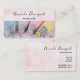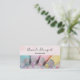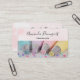 Cartões de visitas com uma fotografia bonito de cor pastel. Apresentando artigos decorativos em azul pastel, rosa, pêssego e amarelo. Colocada sobre uma mesa de madeira com pequenas miçangas coloridas.
