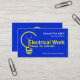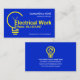 Um cobrir azul brilhante apresenta uma lâmpada amarela criativa onde o filamento da lâmpada é formado pelas palavras "Trabalho elétrico". Abaixo do filamento está o contato telefônico. No canto superior está seu nome prestigioso e título de cargo com uma opção de legenda de slogan para divulgar seus serviços perto da base. No verso, o logotipo amarelo "lâmpada doméstica" está no topo para seu uso. Depois disso vem seu nome prestigioso, os detalhes de contato e uma opção de slogan para divulgar seus serviços. Um cartão criativo de excelente para temas elétricos.
