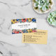 Cartão de visita floral colorido com filas de flores em coral, pincel, azul e amarelo enquadrando seu nome e profissão escritos em uma fonte encantadora. Olhos pegando cartão de visita vibrantes com muitas flores para qualquer profissão, como estilo doméstico, design de interiores, beleza e muito mais. Adicione suas informações de contato às costas em texto preto contra amarelo-claro com ícones de cartão de visita bonitos para endereço, número de telefone, mídia social e muito mais.