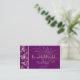 Este design de cartão de visita é certo atrair a atenção e ajudá-lo a estar para fora na multidão. O fundo é ameixa roxa e há um gráfico floral bonito no creme que dá lhe um olhar elegante. Aperfeiçoe para todo o negócio mas especialmente excelente para o salão de beleza nupcial, planeamento wedding, planeamento do evento, restauração, salão de beleza do prego, termas, jóia, cosmetologist, forma, consultante de beleza, ou quando você gostaria de um toque elegante. Adicione sua informação e está pronto para ir!
