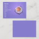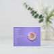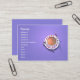 Cartão de visita com uma imagem encantador de um copo, de uns pires e de uma colher com as flores vermelhas pequenas em um fundo roxo.