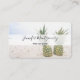 Cartões de visitas com uma fotografia com um par de abacaxis sentados em uma praia arenosa.