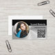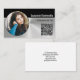 Este design de frente de cartão de visita apresenta um espaço reservado para fotos com nome modelo, ocupação e código QR. A parte traseira inclui um campo modelo para o nome e os detalhes da empresa. Substitua a foto do espaço reservado pela sua fotografia. O link de código QR pode enviar clientes para sua página da Web, fotografias do seu trabalho, referências ou outra página. Preencha os campos de personalização, remova qualquer texto ou edite usando a ferramenta design para selecionar um estilo de fonte, tamanho e cor desejados. Escolha entre doze estilos de papel. A foto do marcador de posição é cortesia em pexels.com.