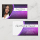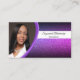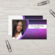 Uma brilhante púrpura falsa define o fundo deste design de cartão de visita com um espaço reservado para fotos à esquerda com o nome e o título do modelo à direita. O verso inclui um design coordenado por cor com campos de texto para o nome comercial e os detalhes. Substitua a foto do espaço reservado pela sua fotografia no formato vertical. Preencha os campos modelo, remova texto ou edite usando a ferramenta design para selecionar um estilo de fonte, tamanho e cor desejados. A foto do marcador de posição é cortesia em pixabay.com.