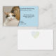 Este cartão de visita de captura visual apresenta sua foto personalizada e todos os seus detalhes estão na frente em um fundo azul pastel. Um coração de patas está atrás. Preencha os campos modelo com suas informações, remova qualquer texto ou edite usando a ferramenta design para selecionar um estilo de fonte, tamanho e cor que você preferir. Substitua a foto personalizada pela sua. Este acabamento de mate de assinatura é ideal para escrevendo no fundo sem manchas. Fotografia de espaço reservado e trabalho de arte, cortesia em pixabay.com.