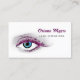 Cartões de visitas de cosmetologia para o especialista em extensões oculares com um belo olho azul com púrpura pálpebras brilhantes. personalize adicionando seu nome e especialidade. Imagem plana, NÃO brilho refletor.