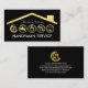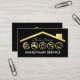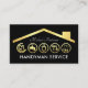 An all black cover features a gold roof with a gold handyman icons tools design. The tools can represent some of the services that you offer e.g. the first roof icon can be for home renovation-repairs, the faucet for plumbing etc. Underneath the roof lies your prestigious name with the business name "HANDYMAN SERVICE" at the base of the card.