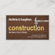 Um requintado cobrir de madeira apresenta um cartaz criativo de "construção" de ouro perto do centro do cartão. ; A letra i da palavra "construção" é substituída por um martelo prateado e um design de prego. Ao lado do martelo prateado no topo está seu nome prestigioso com uma opção de slogan para divulgar seus serviços, abaixo da sinalização "construção" dourada. No canto inferior direito você tem os detalhes do contato.