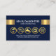 Um cobrir azul escuro com um par de abas douradas protege seu nome de negócios e cargo prestigiados no topo. Logo abaixo, estão cinco ícones falsos de ouro. Os ícones podem representar alguns dos serviços que você oferece. por exemplo, a fita-perfuradora de ouro pode ser para reparações em casa, a escova para remodelação de pinturas, a torneira para canalização, a máquina de lavar para reparações elétricas e as árvores para jardinagem e paisagens, etc. Perto da base, você tem os contatos. No verso, no topo está um logotipo da paisagem dourada que você pode usar. Seguem-se o seu nome prestigioso, os seus dados de contato e um slogan para divulgar os seus serviços. Um cartão de excelente para o trabalhador, reparos em casa, empresas de construção. #construção #empreiteiro #remodelação #empreiteiro de construção #renovação #homerepair #prédios #construção #construção #empreiteiro #artesanato #telhado #ferramentas manuais #zazzlemade
